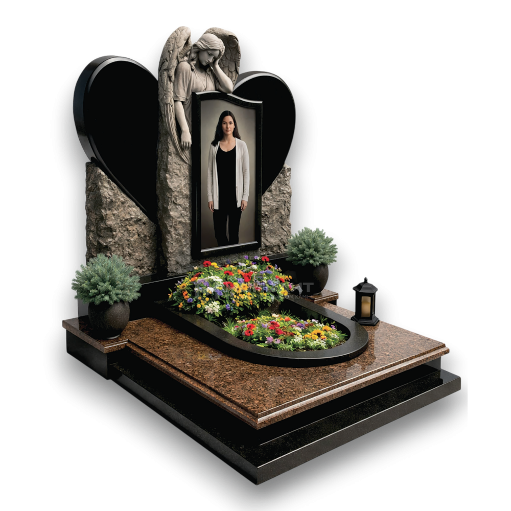 Ангел с крыльями-объятиями. Чёрный гранит + светлая ниша. Фото внутри крыльев — полёт к свету