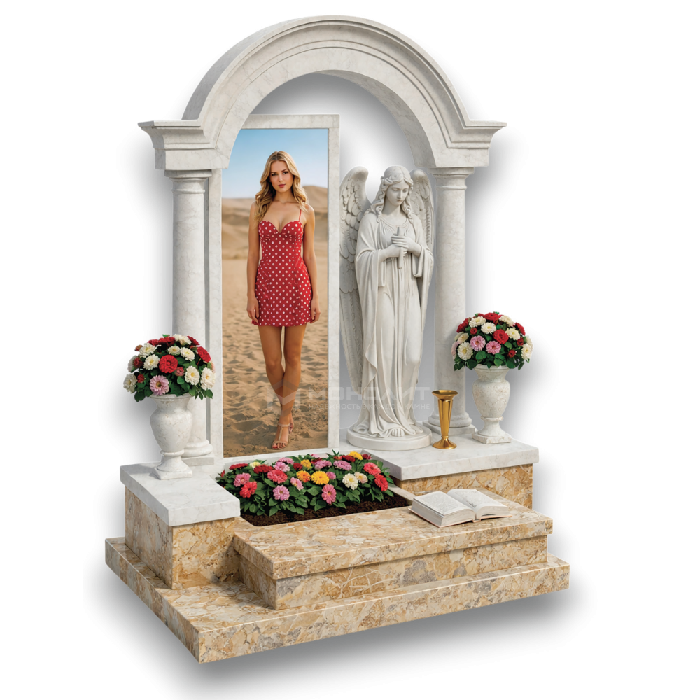 Изысканный мемориальный портик из светлого мрамора и золотистого оникса. Ажурная арка на стройных тосканских колоннах, ростовая скульптура ангела и открытая книга- барельеф на массивном двухъярусном основании — возвышенная чистота, покой и светлая печаль