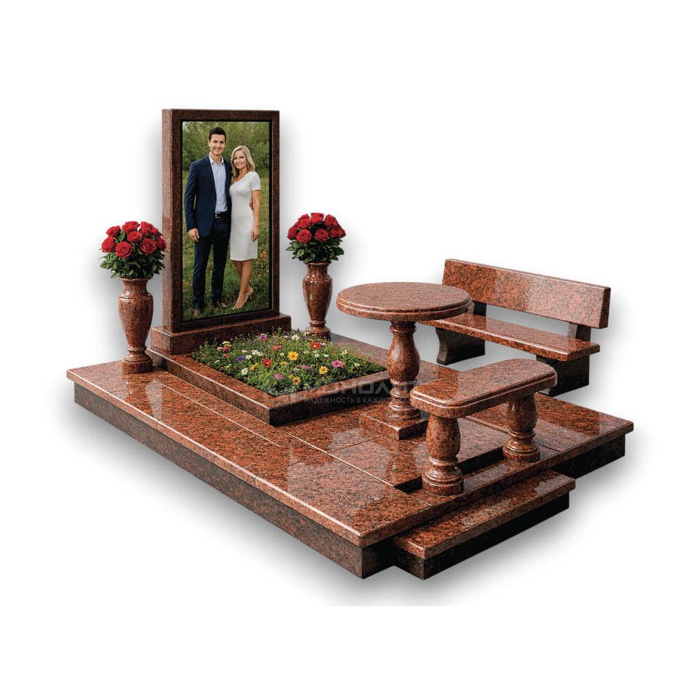 Высокая вертикальная стела. Благородный красный гранит. Полноростовой портрет, зона отдыха со столиком и скамьей — единство и уют вечной памяти