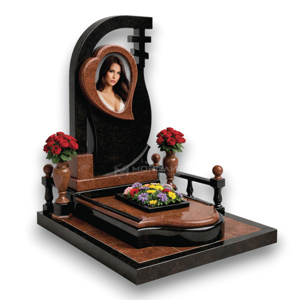 Фигурная стела с православным крестом. Контрастный черный и красный гранит. Фоторамка в форме сердца, резной цветник и гранитная ограда — нежность и преданность навсегда