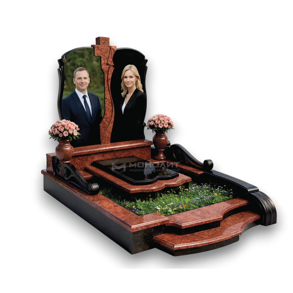 Изящный двойной мемориал с резным крестом. Сочетание глубокого черного и насыщенного красного гранита. Фигурные барельефы, закрытая надгробная плита и пышный цветник — символ неразрывной связи и вечного уважения.