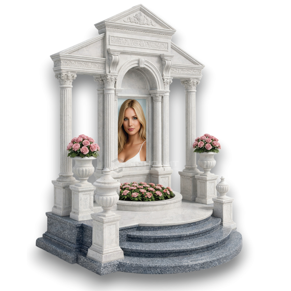 Величественный мемориальный портик в стиле высокого классицизма из светлого мрамора. Сложная многоярусная композиция с фронтоном, ионическими колоннами, глубокой арочной нишей и парадной входной группой с радиусными ступенями — триумф формы, статусное благородство и вечный покой