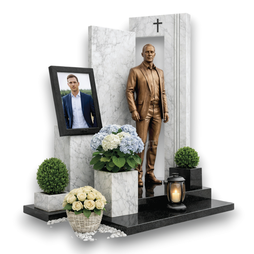 Современная многоуровневая композиция из белого мрамора и черного гранита. Бронзовая скульптура в полный рост, строгие геометрические формы и живое озеленение — триумф личности и светлая память