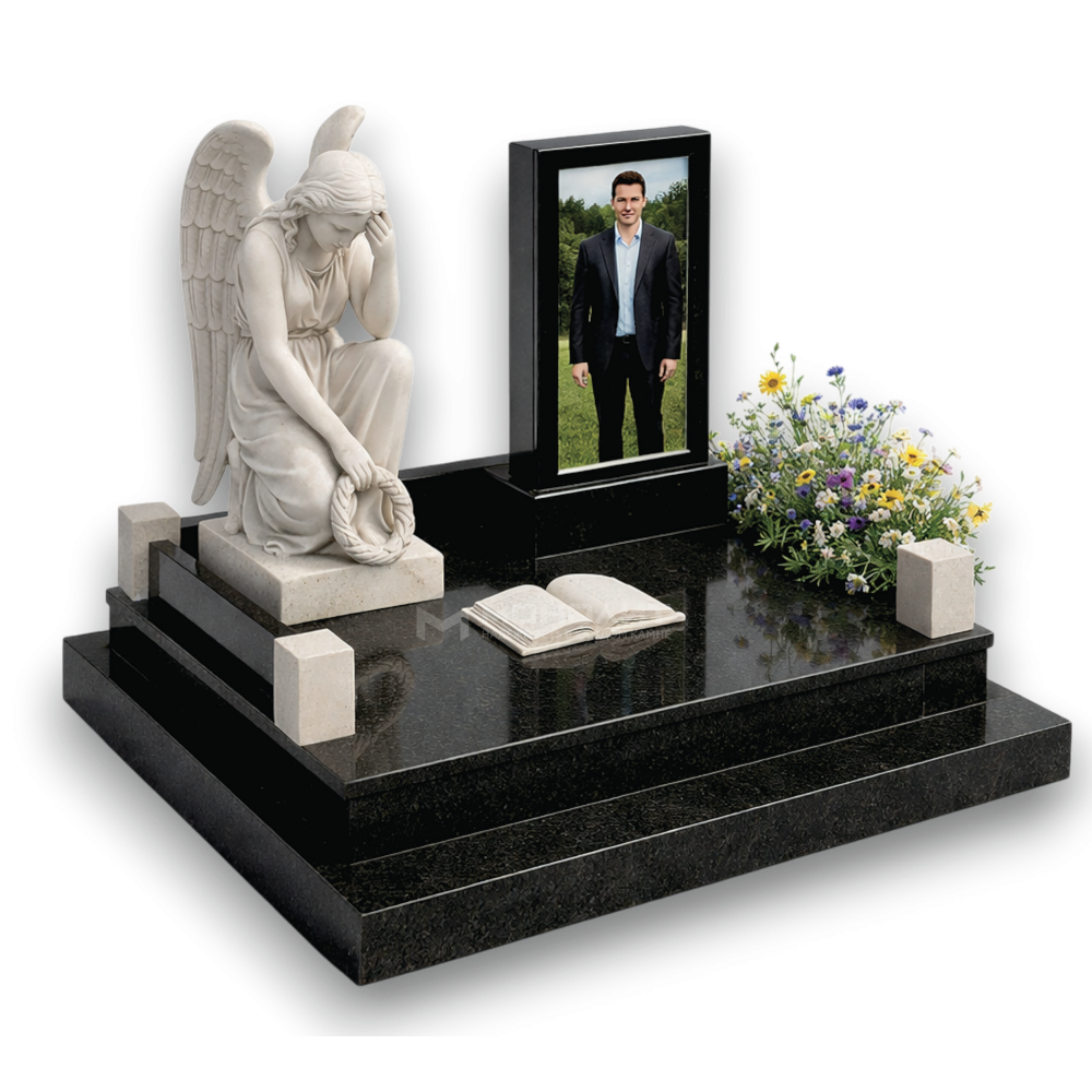 Лаконичный монумент из черного зеркального гранита. Скульптура коленопреклоненного ангела, раскрытая книга и живые цветы — тихая печаль и бесконечное почтение