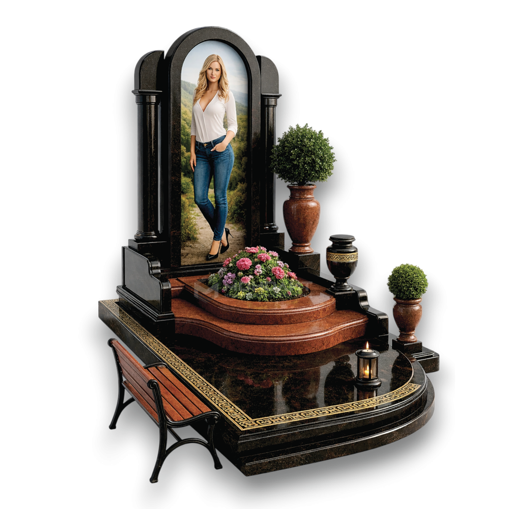 Классический арочный портал с колоннами. Сочетание черного и шоколадного гранита с золотым орнаментом. Полноростовой портрет, ступенчатый цветник и парковая скамья — изящество линий и благородство вечного покоя