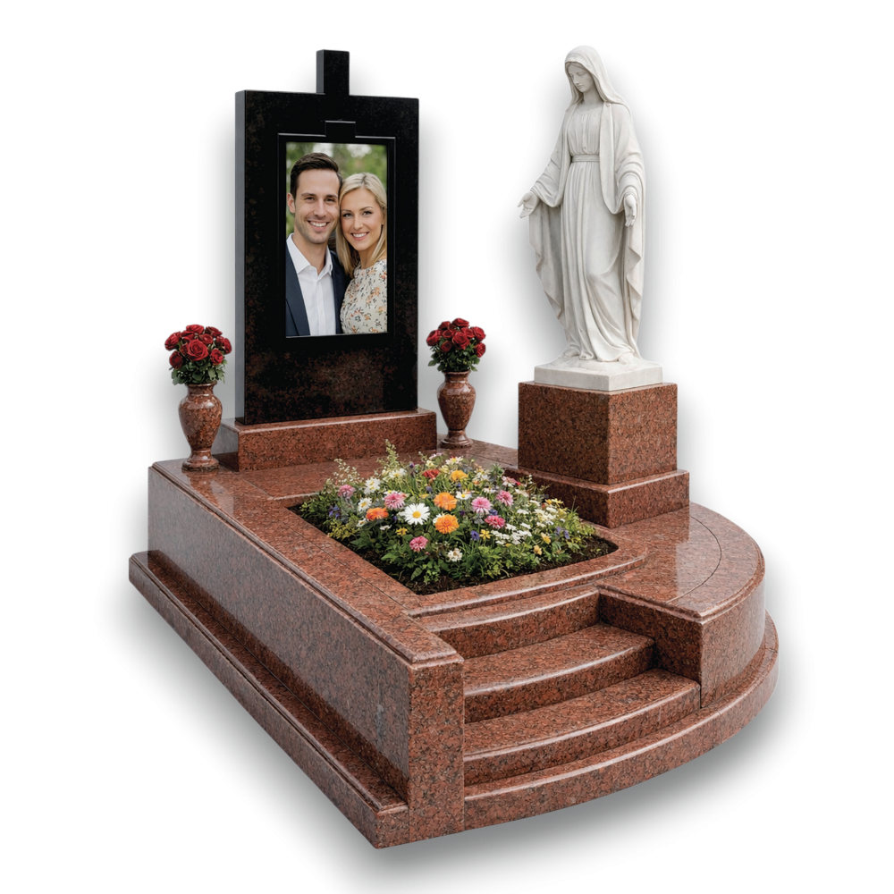 Монументальный подиум из красного гранита со скульптурой Девы Марии. Строгая черная стела, полукруглые ступени и цветущий сад — смирение, защита и свет вечного упокоения