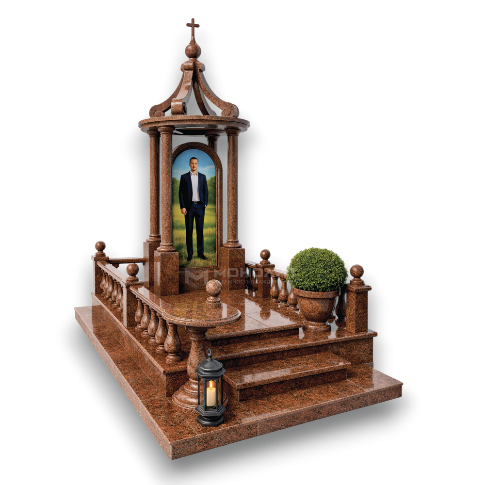 Величественный мемориал в виде классической беседки. Насыщенный коричневый гранит. Купольный свод на колоннах, фигурная балюстрада и гранитный столик — архитектурное совершенство и вечная защита