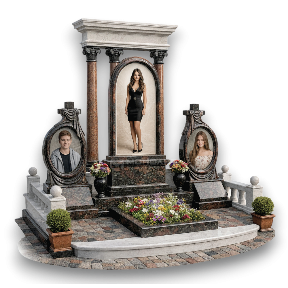 Семейный пантеон в античном стиле. Коричневый гранит и светлый мрамор. Высокий портик с коринфскими колоннами, овальные медальоны и мощеная площадка — величие рода и незыблемость традиций