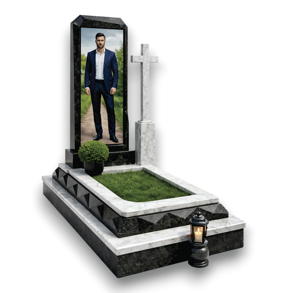 Геометрический мемориал с объемным декором. Черный гранит и белый мрамор. Высокая стела, лаконичный крест и ступенчатое основание с резным узором — строгость линий и чистота помыслов