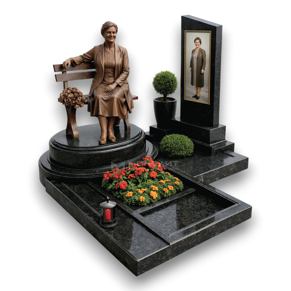 Камерный мемориальный комплекс из темного полированного гранита. Бронзовая скульптура женщины на садовой скамье, лаконичная вертикальная стела и многоуровневый подиум — живой образ, тепло и вечное присутствие