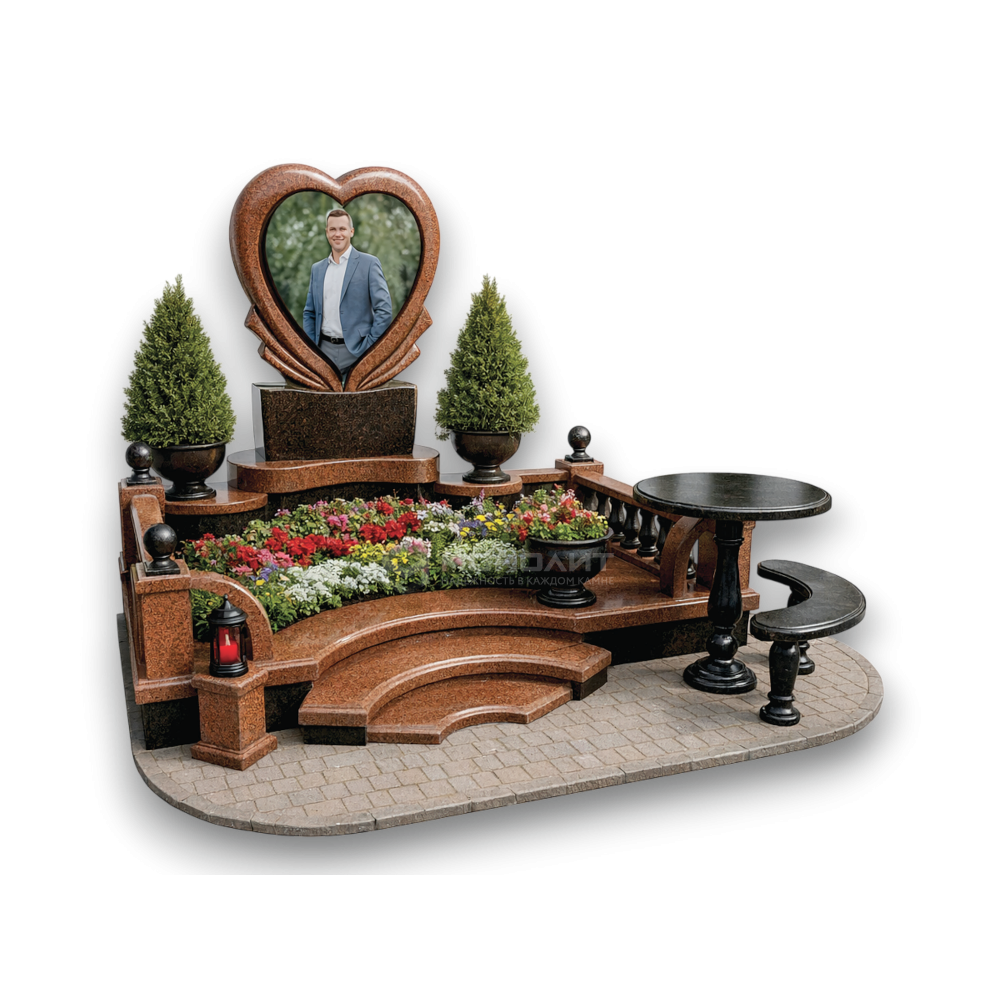 Эмоциональный мемориальный ансамбль из коричневого и черного гранита. Фигурная стела-сердце, радиусный подиум со ступенями и полноценная зона отдыха — глубокое чувство и тепло семейной памяти