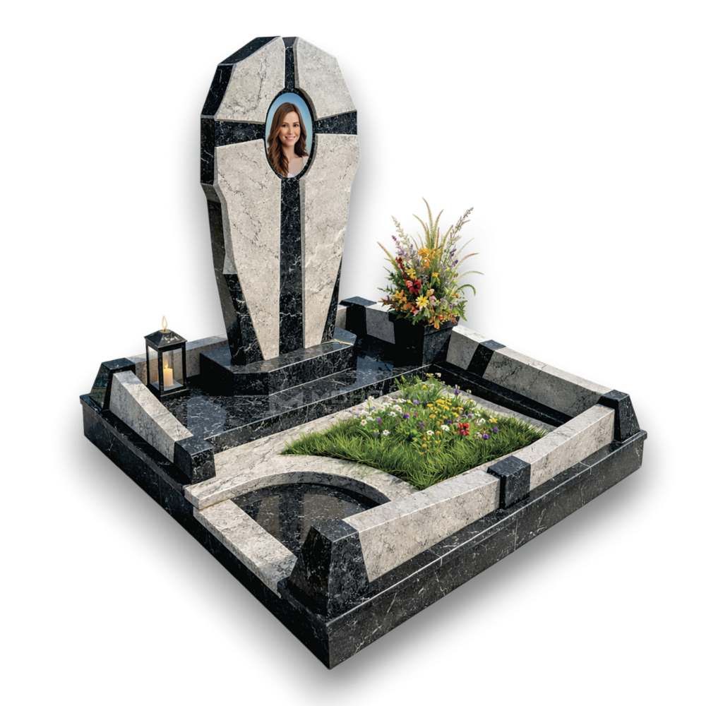 Футуристичный монолит из светлого мрамора и черного гранита. Сложная многогранная стела с овальным медальоном, геометричная ограда и интегрированный цветник — чистота формы и сияние вечной памяти