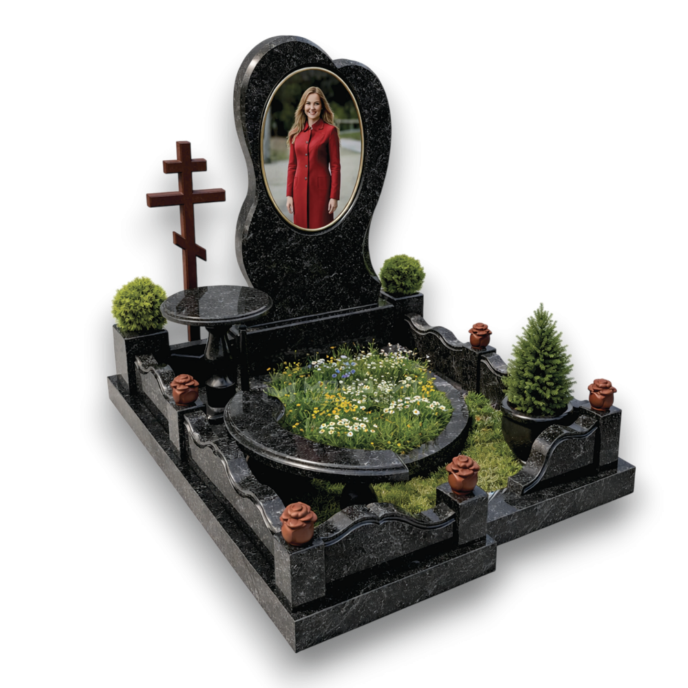 Элегантный мемориальный ансамбль из черного полированного гранита. Асимметричная стела в форме сердца, радиусная скамья с гранитным столиком и волнообразная ограда с декоративными розами — нежность образа и вечная любовь