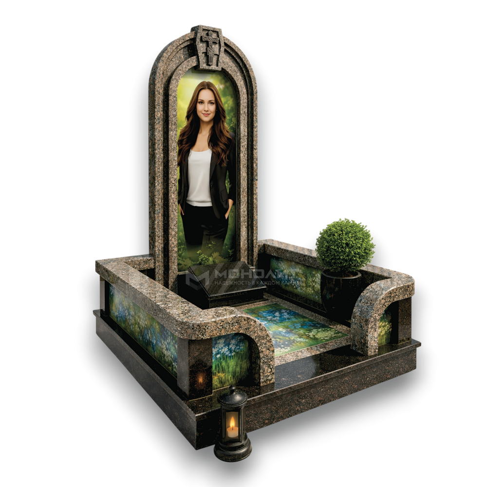 Монументальная арочная композиция из серо-коричневого гранита. Высокая многоуровневая стела с резным барельефом креста, массивный цоколь с радиусными элементами и витражные вставки в ограде — торжественность классики и свет вечной весны