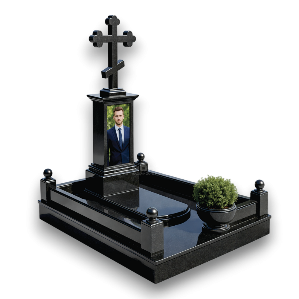 Традиционный православный монумент из глубокого черного гранита. Высокий пилон с ростовым портретом, венчающий его массивный восьмиконечный крест и строгая ограда со столбиками-сферами — незыблемость веры и торжественное спокойствие