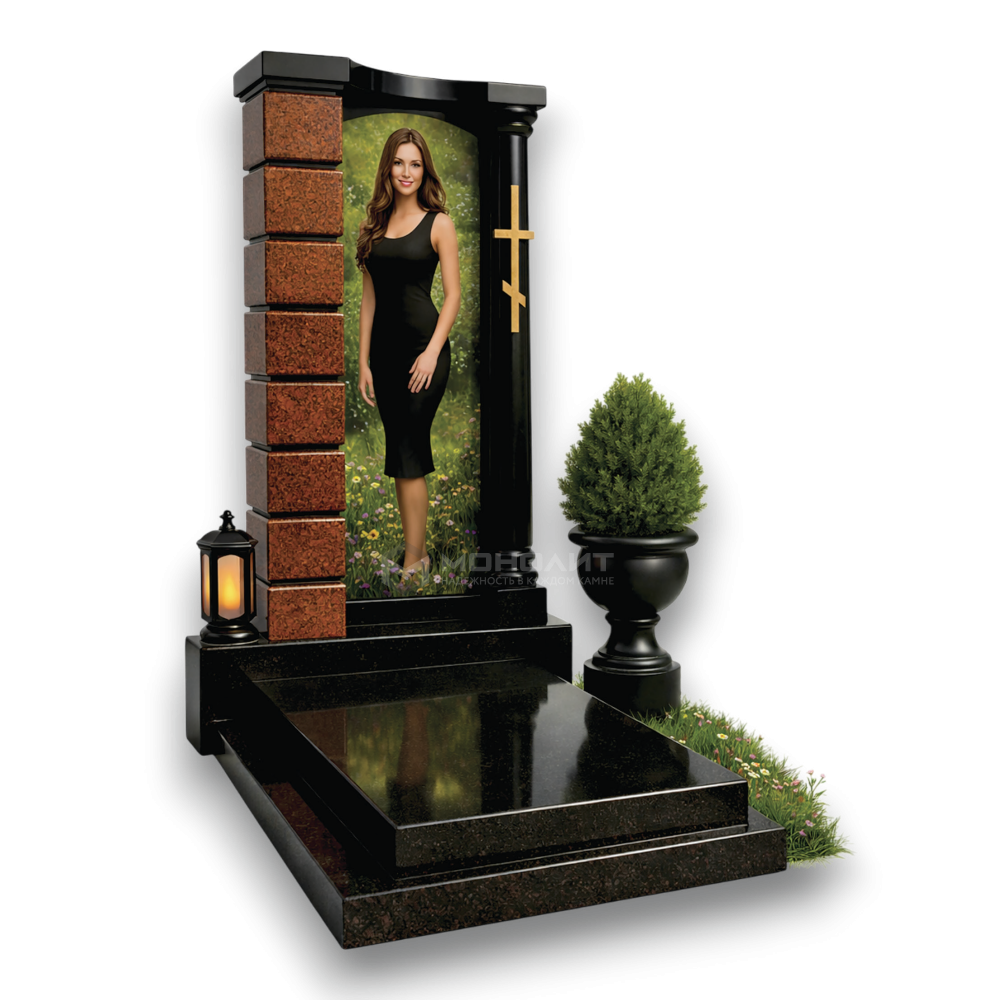 Комбинированный мемориал из черного гранита и терракотового камня. Массивная левая колонна из наборных блоков, изящная правая пилястра с золоченым крестом и двухуровневое надгробие — архитектурная ритмика, строгость и вечная память