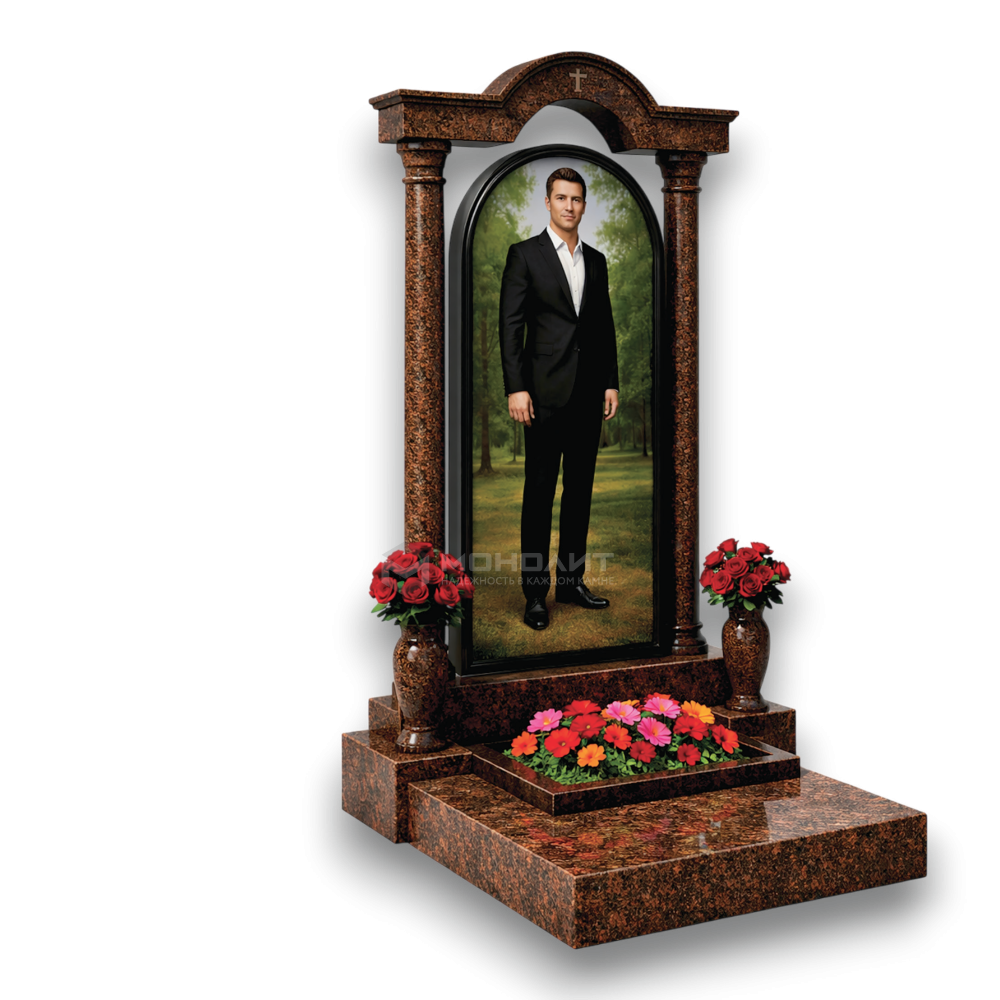 Торжественный мемориальный ансамбль из коричневого гранита. Арочная стела, обрамленная стройными колоннами с капителями, массивный цоколь и интегрированный цветник — монументальность, строгие пропорции и вечное благородство