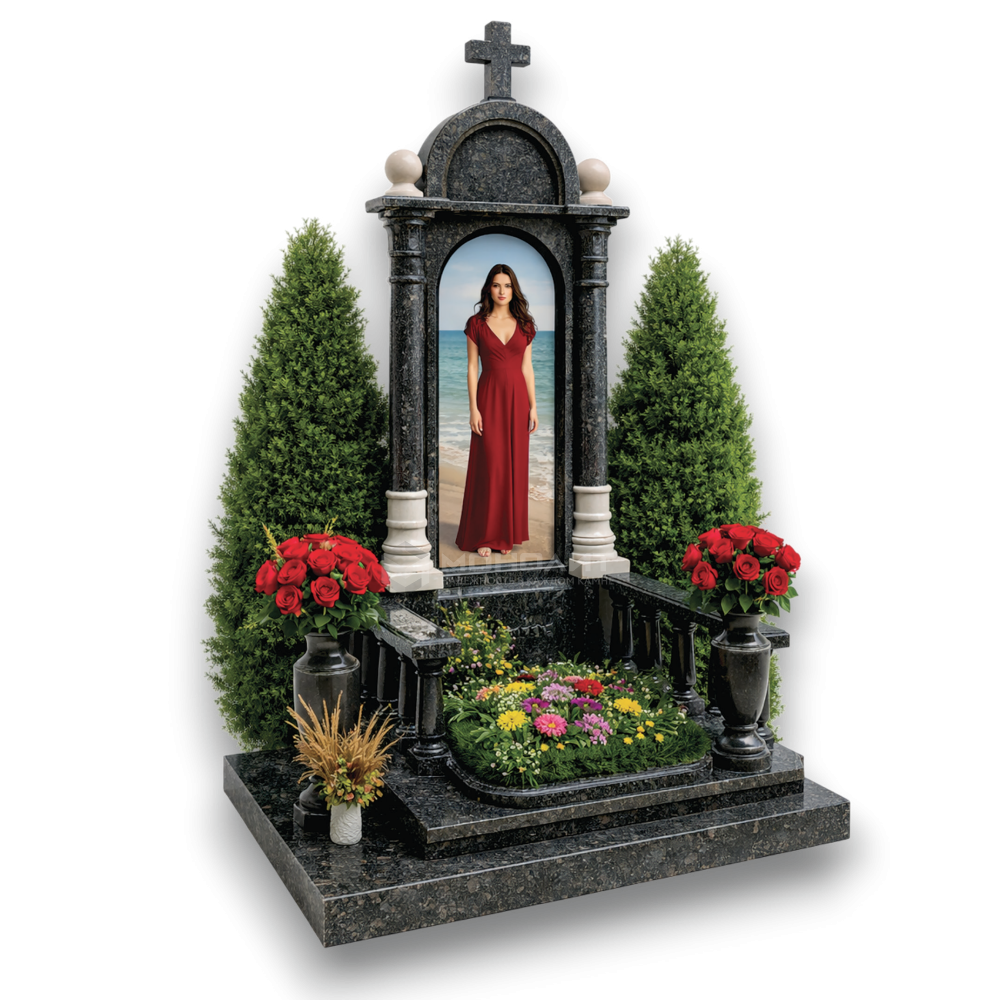 Монументальный мемориальный портал из темного лабрадорита с синими искрами. Высокая арка на колоннах с белокаменными капителями, балюстрада с фигурными балясинами и ступенчатый цоколь — величие классики, глубина камня и торжественный покой