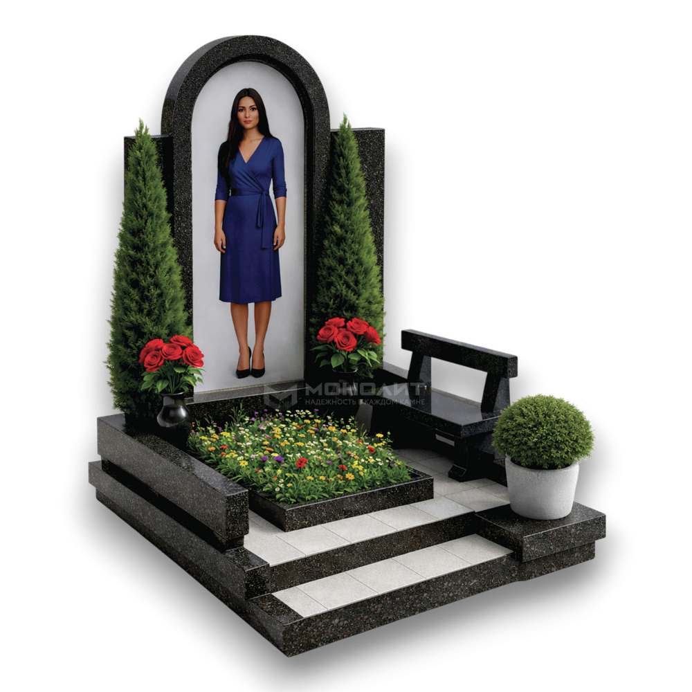 Лаконичный мемориальный комплекс из темного полированного гранита. Высокая арочная стела с контрастным светлым фоном, двухцветное мощение ступеней и интегрированная зона отдыха со скамьей — чистота геометрии, уют и вечный покой