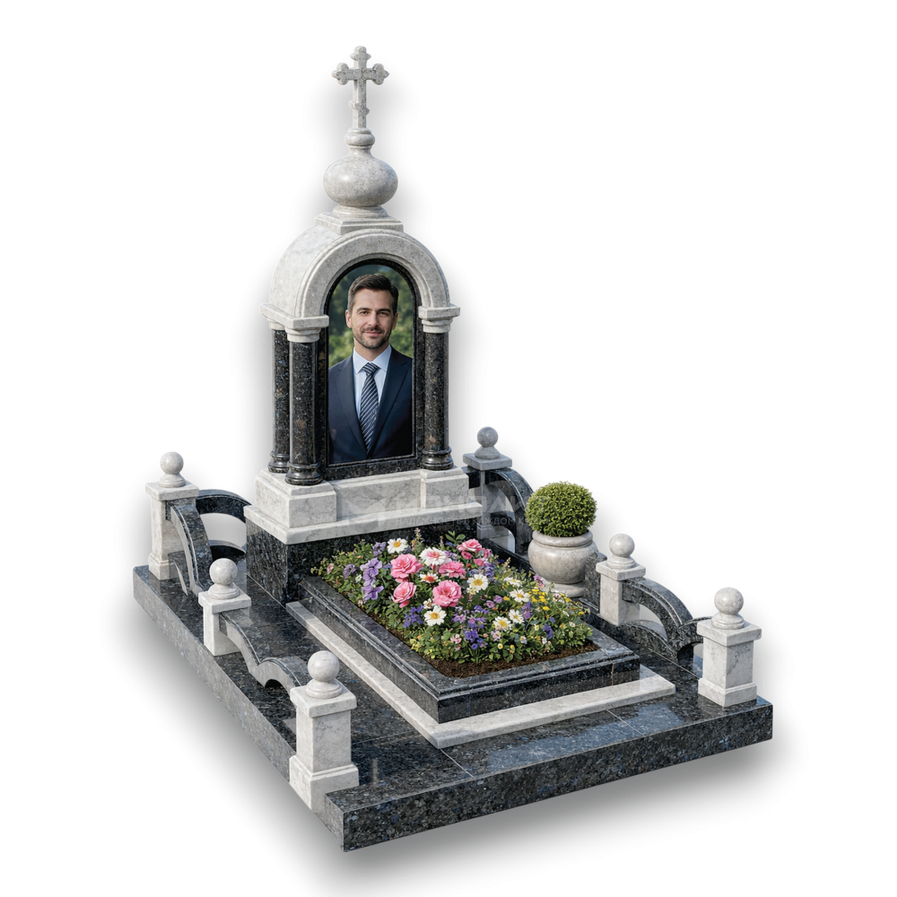 Величественная мемориальная часовня из темного лабрадорита и светлого мрамора. Высокая стела-портал с купольным завершением и крестом, стройные колонны и ажурная ограда с радиусными элементами — духовность, архитектурное изящество и вечный свет