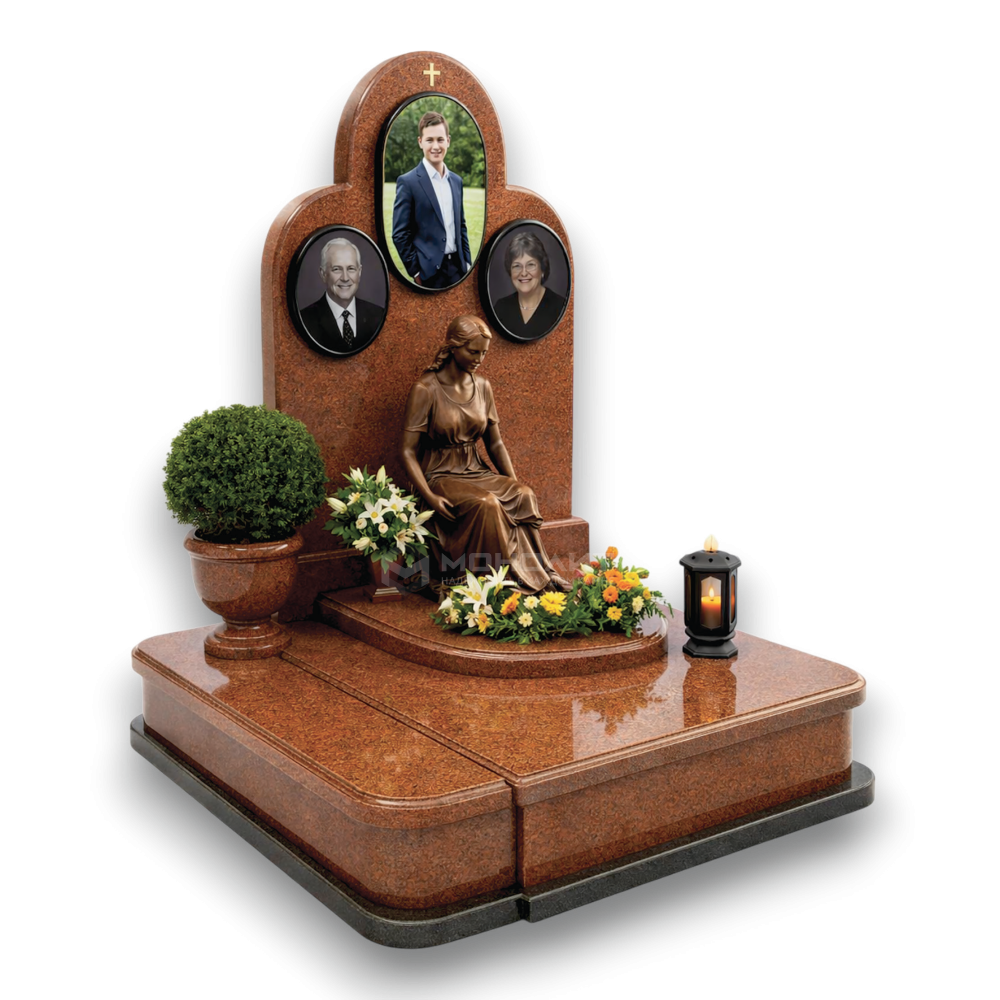 Величественный мемориал из терракотового гранита для семейного захоронения. Трехчастная стела с мягкими радиусными обводами, центральная бронзовая скульптура скорбящей и массивное двухъярусное основание — преемственность поколений, благородство и вечный покой
