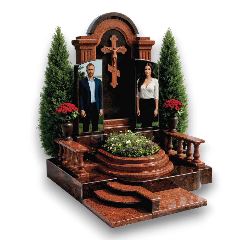 Величественный мемориальный ансамбль из красного гранита и черного диабаза. Центральный портал с рельефным распятием, симметричные стелы с портретами и парадный вход с радиусными ступенями — преемственность поколений, благородство и торжественный покой