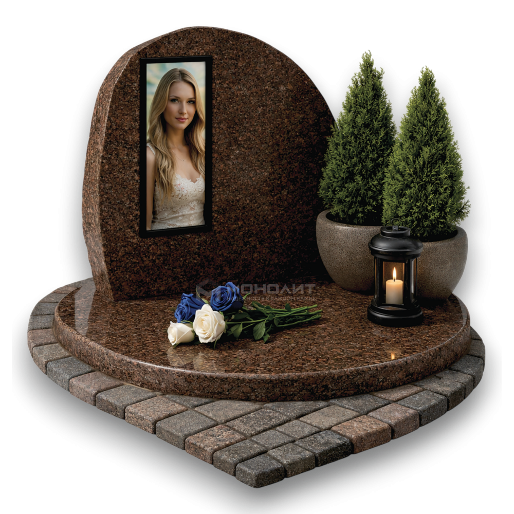 Минималистичный мемориал из благородного коричневого гранита. Округлая асимметричная стела на массивном дисковом основании с контрастным мощением из натуральной брусчатки — мягкость форм, природная эстетика и вечный покой