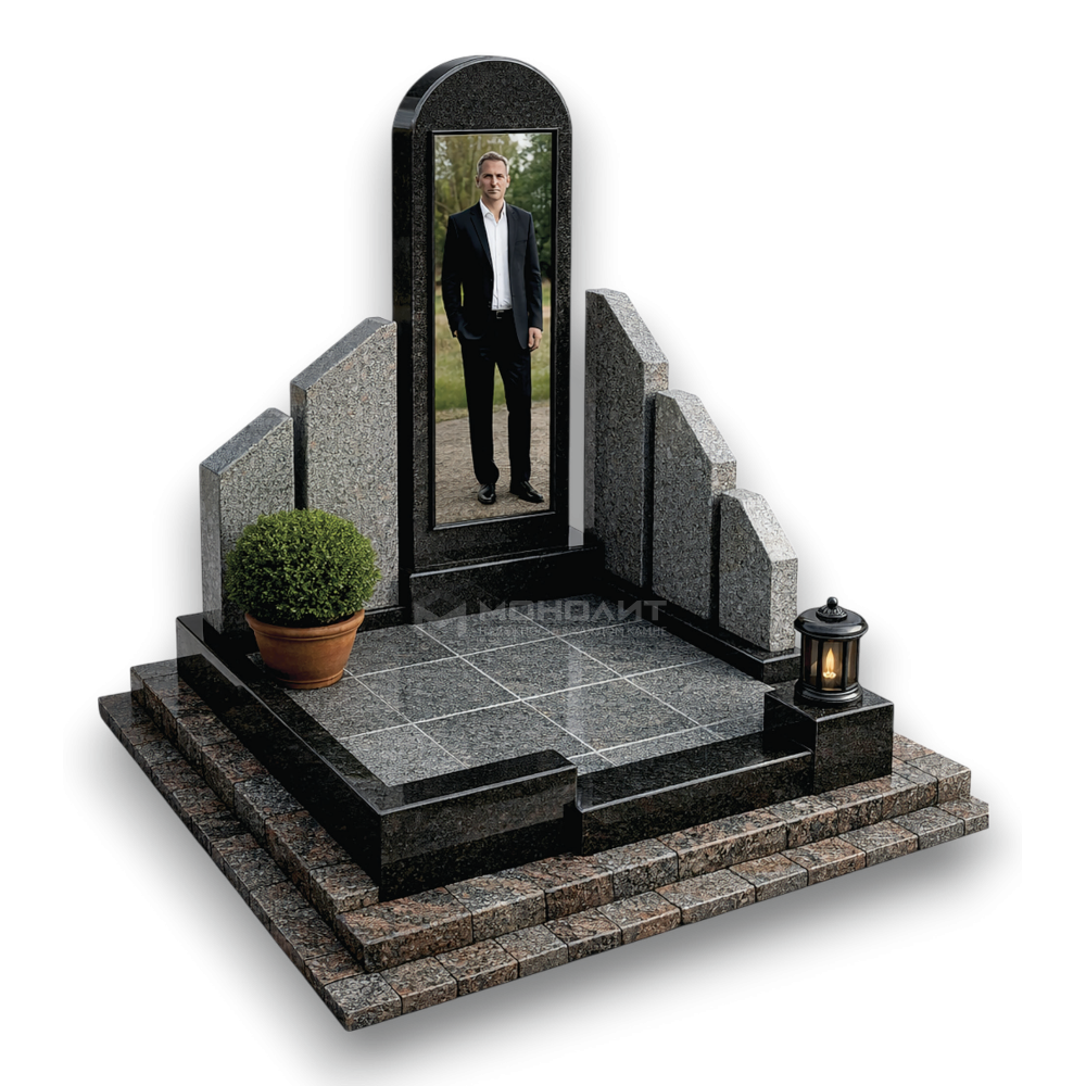 Современный архитектурный ансамбль из контрастного гранита. Центральная арочная стела, обрамленная динамичными каскадными пилонами разной высоты, и трехуровневое основание с массивным цоколем — ритм форм, величие и непоколебимый покой