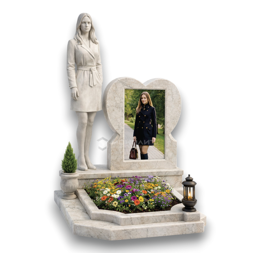 Светлый мемориальный ансамбль из благородного мрамора. Ростовая скульптура в классическом стиле, фигурная стела- рама в форме сердца и многоуровневый открытый цветник — художественное изящество, чистота образа и бесконечная любовь