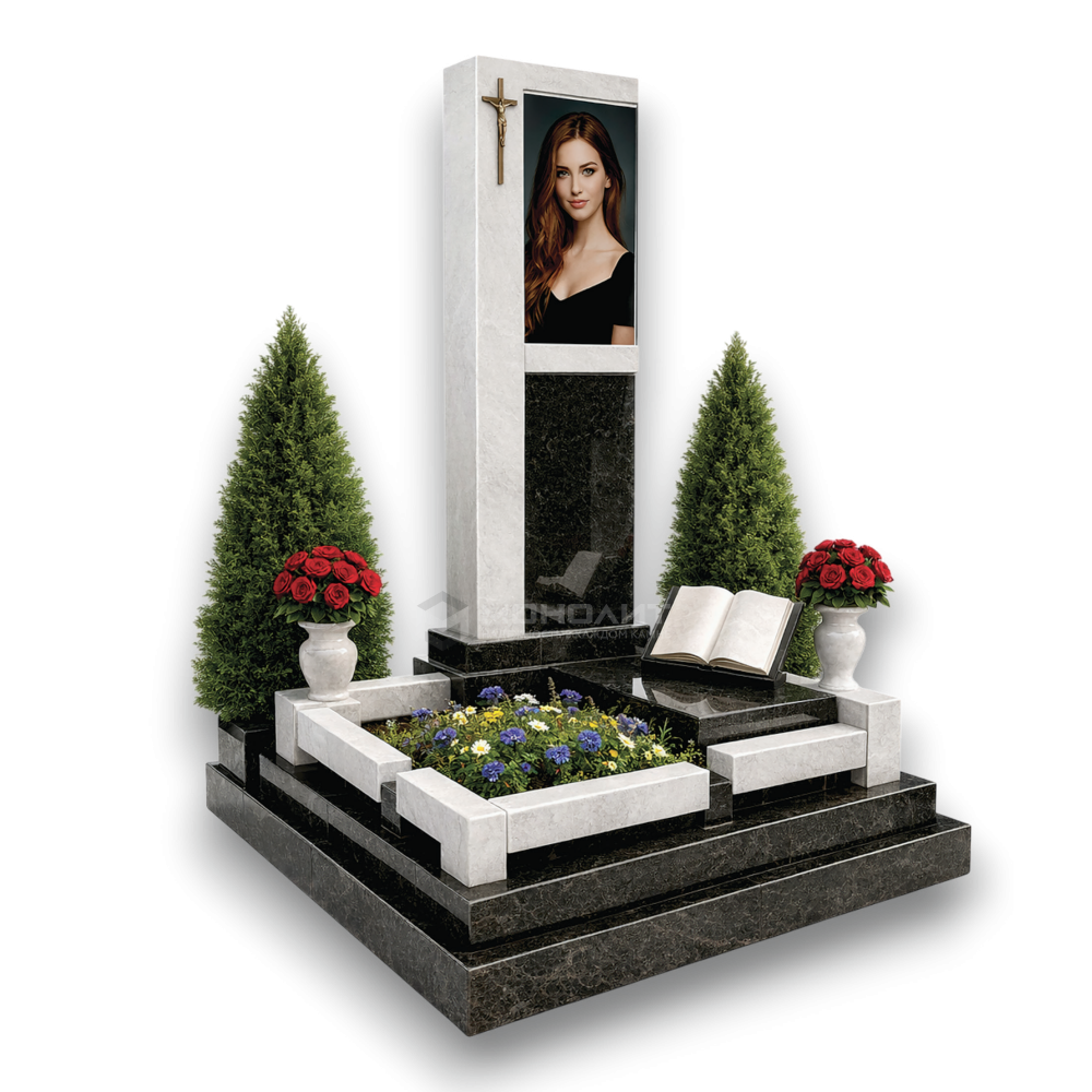 Лаконичный современный мемориал в стиле минимализма. Комбинированная высокая стела из белого мрамора и черного гранита, дополненная открытой книгой-барельефом и строгим многоярусным основанием — чистота линий, интеллектуальное благородство и вечная память
