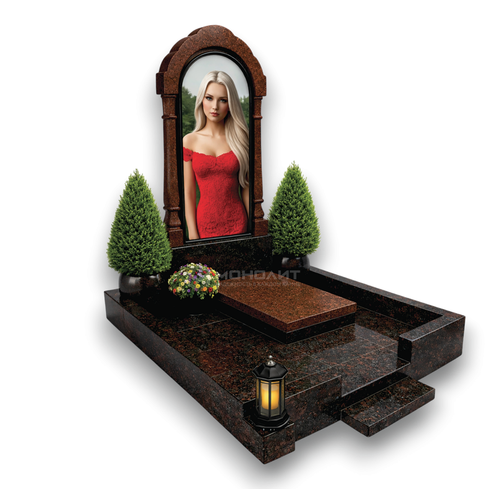 Монументальный мемориальный комплекс из глубокого темного и насыщенного коричневого гранита. Высокая арочная стела с выразительным багетом, массивный цоколь с широким парапетом и ступенчатый вход — строгость форм, долговечность и величественный покой