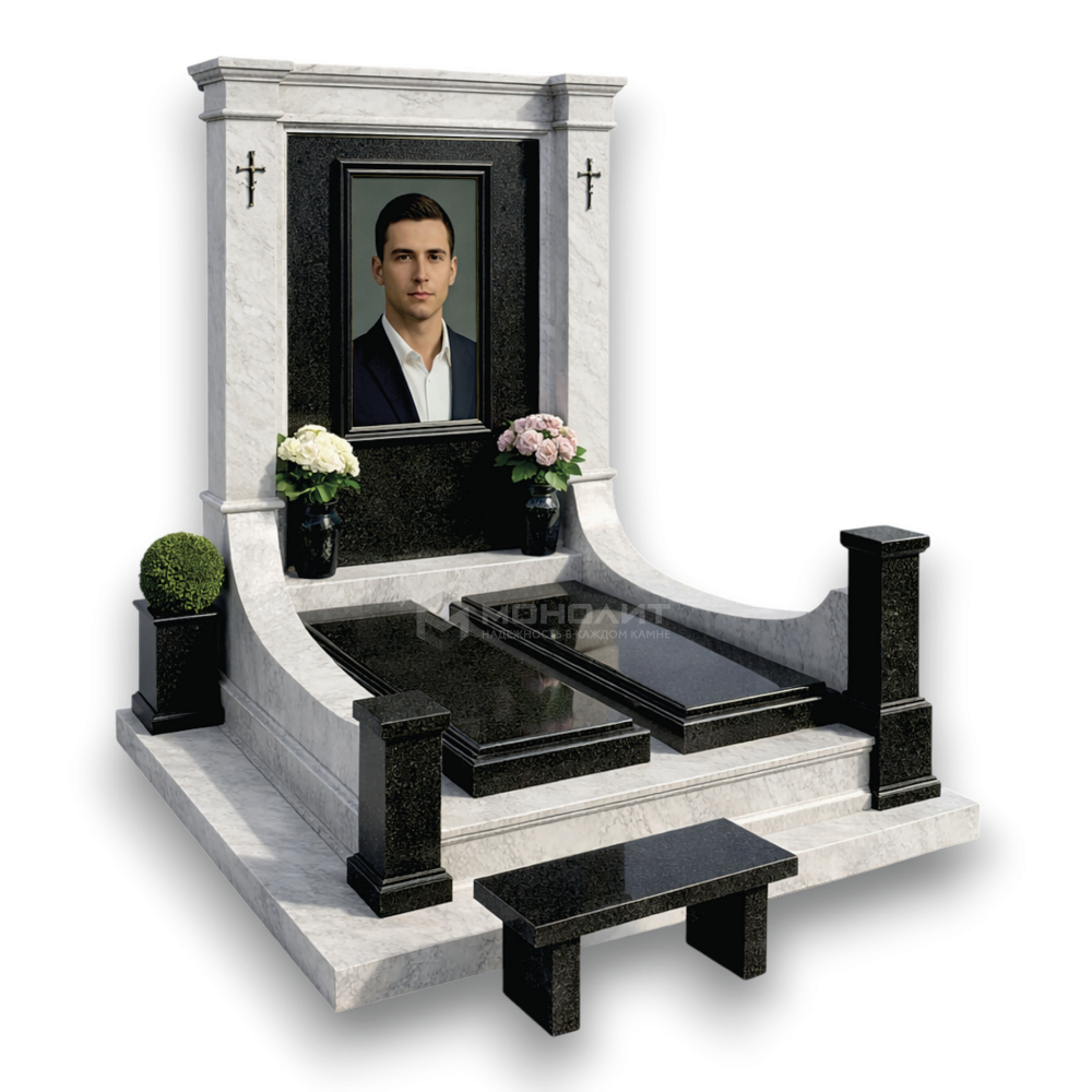 Торжественный мемориальный ансамбль из светлого мрамора и глубокого черного гранита. Высокая стела-портал с классическим карнизом, элегантные вогнутые парапеты, переходящие в тумбы, и парное надгробие — чистота линий, монументальность и вечный покой