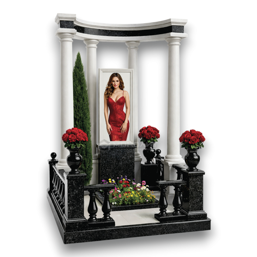 Роскошный мемориальный ансамбль в классическом стиле. Высокая полукруглая колоннада с массивным антаблементом, центральный постамент с портретом в раме и парадная балюстрада с фигурными балясинами — триумф архитектуры, величие и вечная память