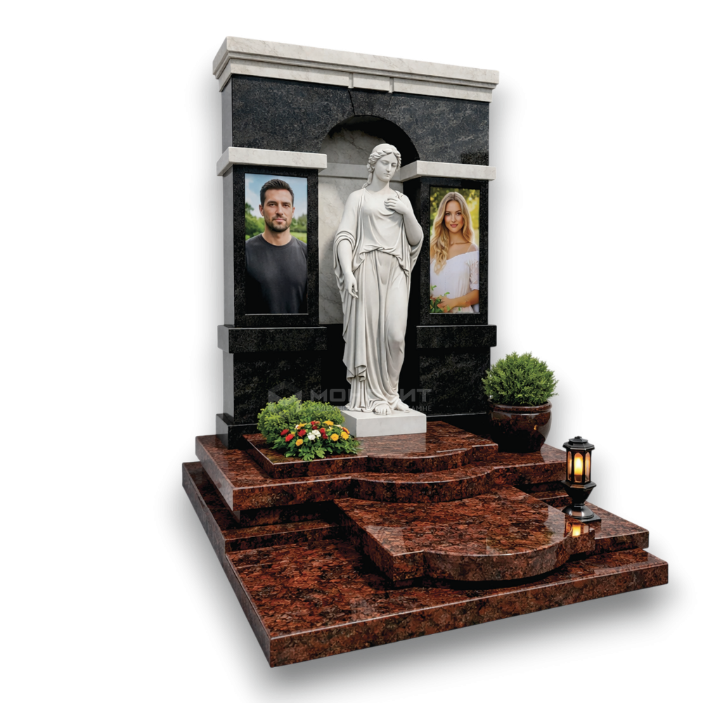 Монументальный мемориальный ансамбль из черного габбро и коричневого гранита. Высокий классический портал с глубокой нишей, центральная ростовая скульптура из белого мрамора и сложный трехуровневый подиум с радиусными ступенями — величие эпох, художественное превосходство и вечный покой